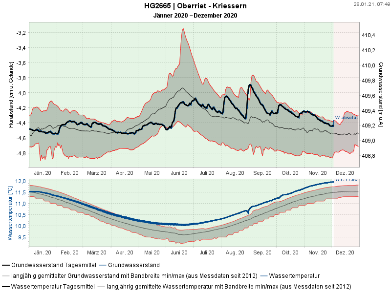 Grundwasserstand Absolut und Flurabstand mit Temperatur und mehrjährigen Werten: